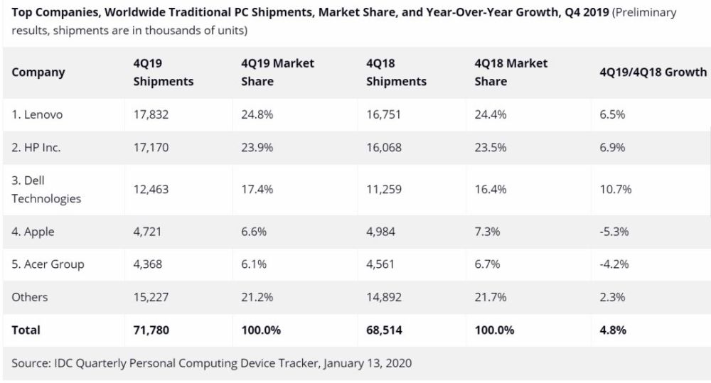 宏碁(Acer Group):以6.1%的季度商场占有率和6.4%的全年商场占有率跻身前五名。但2019年第四季度销量下降了4.2%,全年下降了4.6%。