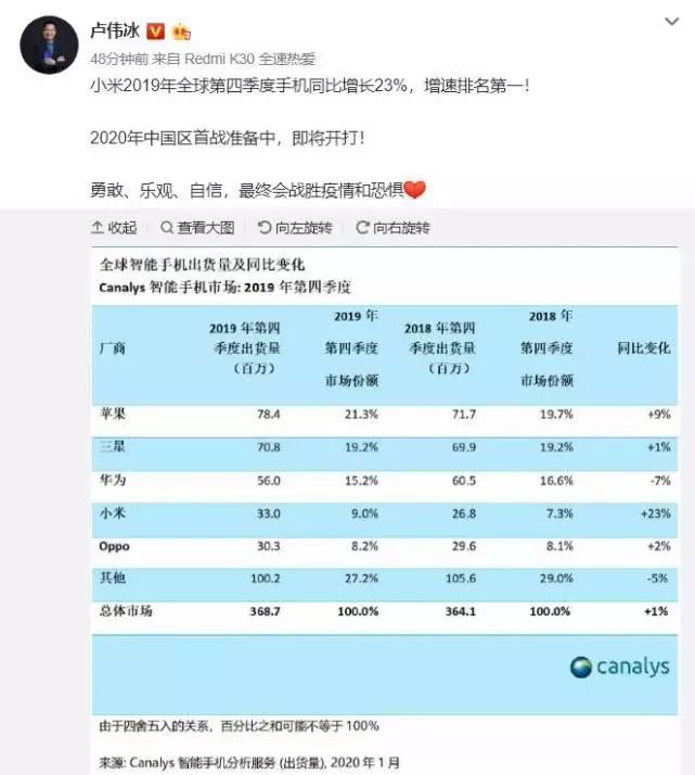 就在今天有好几个全球闻名的数据调研公司出具了2019年全球智能手机陈述,一起包括2019年第四季度的数据陈述。在这些数据出台之后,卢伟冰称:小米2019年全球第四季度手机同比增加23%,增速排名榜首!2020年我国区首战预备中,行将开打!英勇、达观、自傲,终究会打败疫情和惊骇。