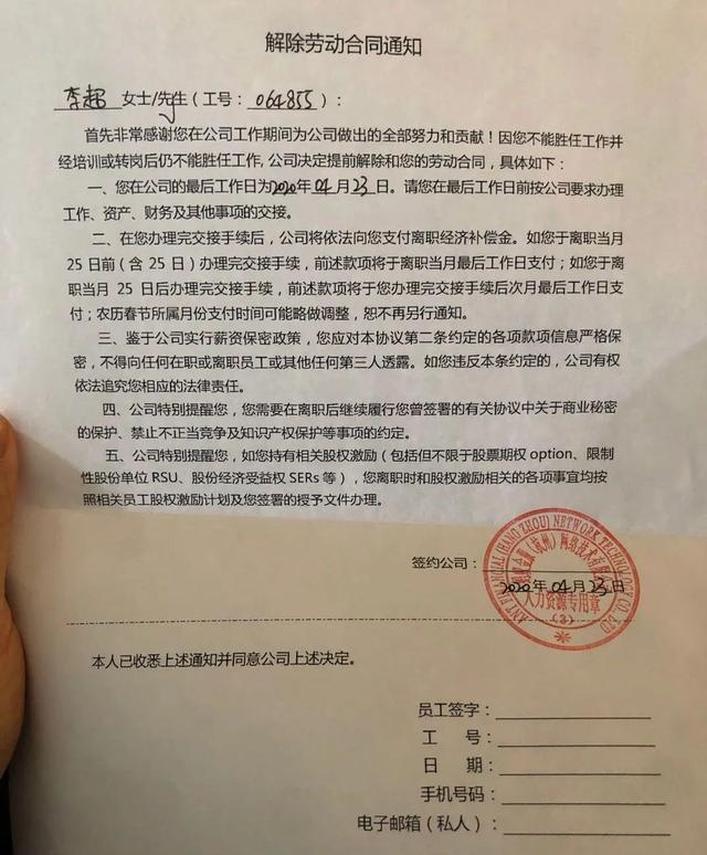 李超表明,自己爱在阿里味(阿里和蚂蚁职工内部沟通论坛)发发帖子,此前也被hrg(人力资源专员)提过醒,少在阿里味发帖。此次,蒋凡事情出来后,自己也宣布了一些观点,浏览量现在听说现已破10万多了。不过,这次没有等来hrg说话,却等来了一纸劳动合同解约书。