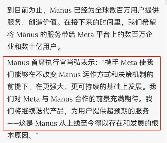Manus首席执行官肖弘也随即表态称:“携手meta使我们能够在不改变Manus运作方式和决策机制的前提下,在更强大、更可持续的基础上发展。我们对meta与Manus合作的前景充满期待。我们将继续迭代产品,为用户提供超预期的服务。”